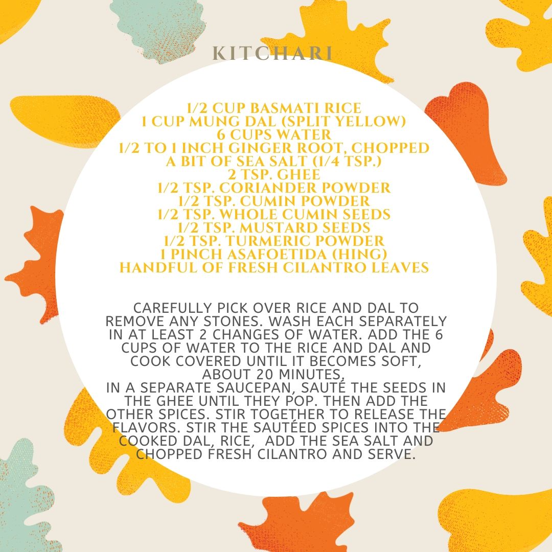 During the fall transition to winter, there can be vata imbalances- too cold, too windy, too dry. The Ayurveda dish Kitchari can help you transition and minimize discomfort. Kitchari is a porridge-like mixture of Basmati rice and moong dal (split mung beans) simmered in turmeric, cumin seeds, and ginger. Kitchari can have a balancing effect on the body. Kitchari is made from split mung-beans. Studies of the mung bean show that they have antioxidant, antimicrobial, anti-inflammatory, antidiabetic, antihypertensive, lipid metabolism accommodation, antihypertensive, and antitumor effects. (1)
